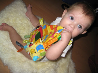 This is such a fun time in Max's babyhood. The two top teeth have just broken through, he's a pro at the army crawl and he's trying to pull himself up. He 'talks' and laughs and is such a happy boy.